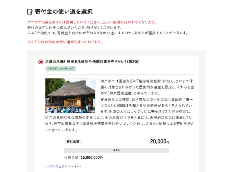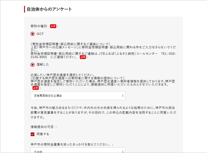 ⑤「寄付金額」→「寄付金の使い道を選択」→「申込情報の入力」→「自治体からのアンケート」の応援したい神戸歴史遺産の選択欄から「④有馬芸妓文化公演会」を選び、最終画面まで進んで決済完了です!